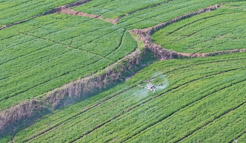 近日,安徽省合肥市蜀山区小庙镇北分路村一处麦田里无人机往来穿梭,农户通过操作手机软件,指挥无人机播撒药剂防治虫害。 陈三虎 摄(来源:大国三农)