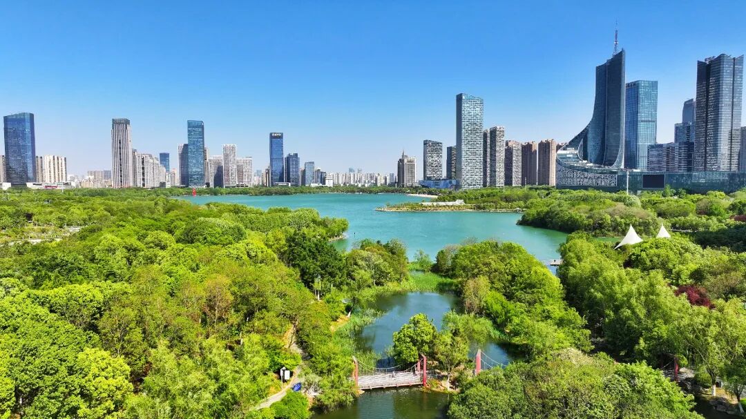 天鹅湖文化商务区楼宇林立、景色宜人。